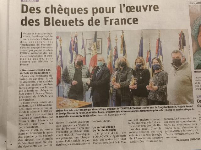 La boulangerie Ranchain, quant à elle, créatrice de la madeleine du Souvenir, a reversé une partie des bénéfices des ventes de ce gâteau à l'Œuvre nationale du Bleuet de France.
