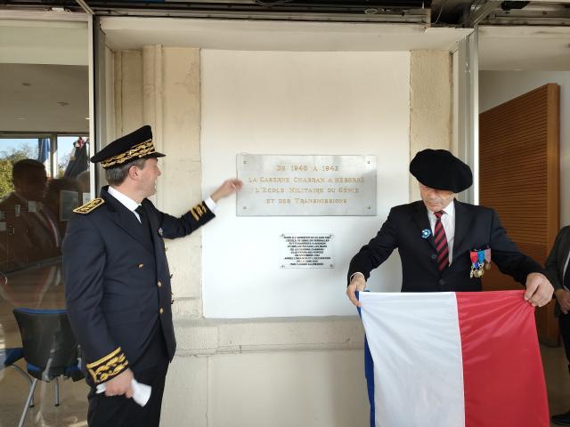 Le dévoilement de l'une des deux plaques par le préfet Bertrand Gaume et le général Roland Weck.