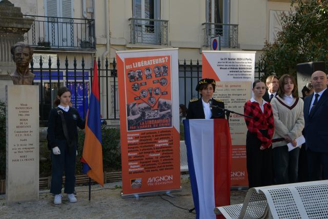 La secrétaire générale de la préfecture de Vaucluse, Mme Sabine Roussely, a insisté dans son allocution sur le rôle joué par les résistants étrangers dans la libération du territoire. Fait notable, deux établissements scolaires avignonnais, les collèges Viala et Champfleury, s'étaient mobilisés pour honorer ces femmes et ces hommes qui rêvaient d'une France universaliste et émancipatrice. Ils interprétèrent à cette occasion des chants et lurent des textes en présence de nombreux porte-drapeaux.