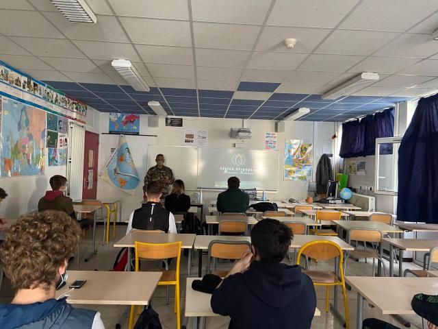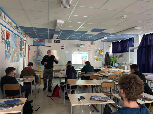 Les élèves de la classe « Défense » du lycée professionnel Martin-Bret de Manosque ont bénéficié au sein de leur établissement, le 4 février 2021, d'une intervention sur le thème des opérations extérieures. Cette action en milieu scolaire s’inscrit dans le partenariat renforcé entre le service départemental, la délégation militaire départementale et l’Éducation nationale.