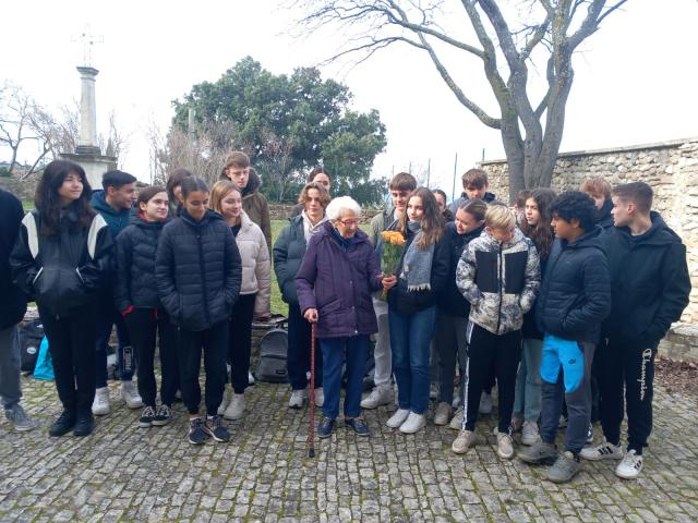 Raymonde d'Isernia entourée par les élèves de troisième du collège Saint-Gabriel de Valréas.